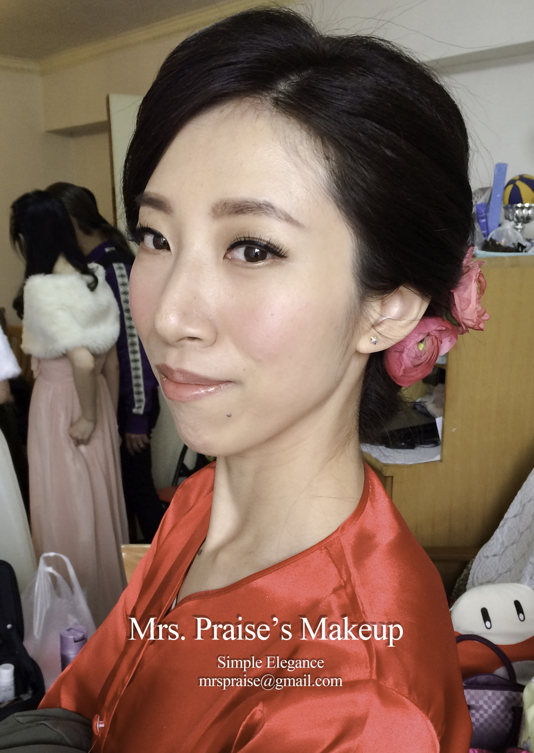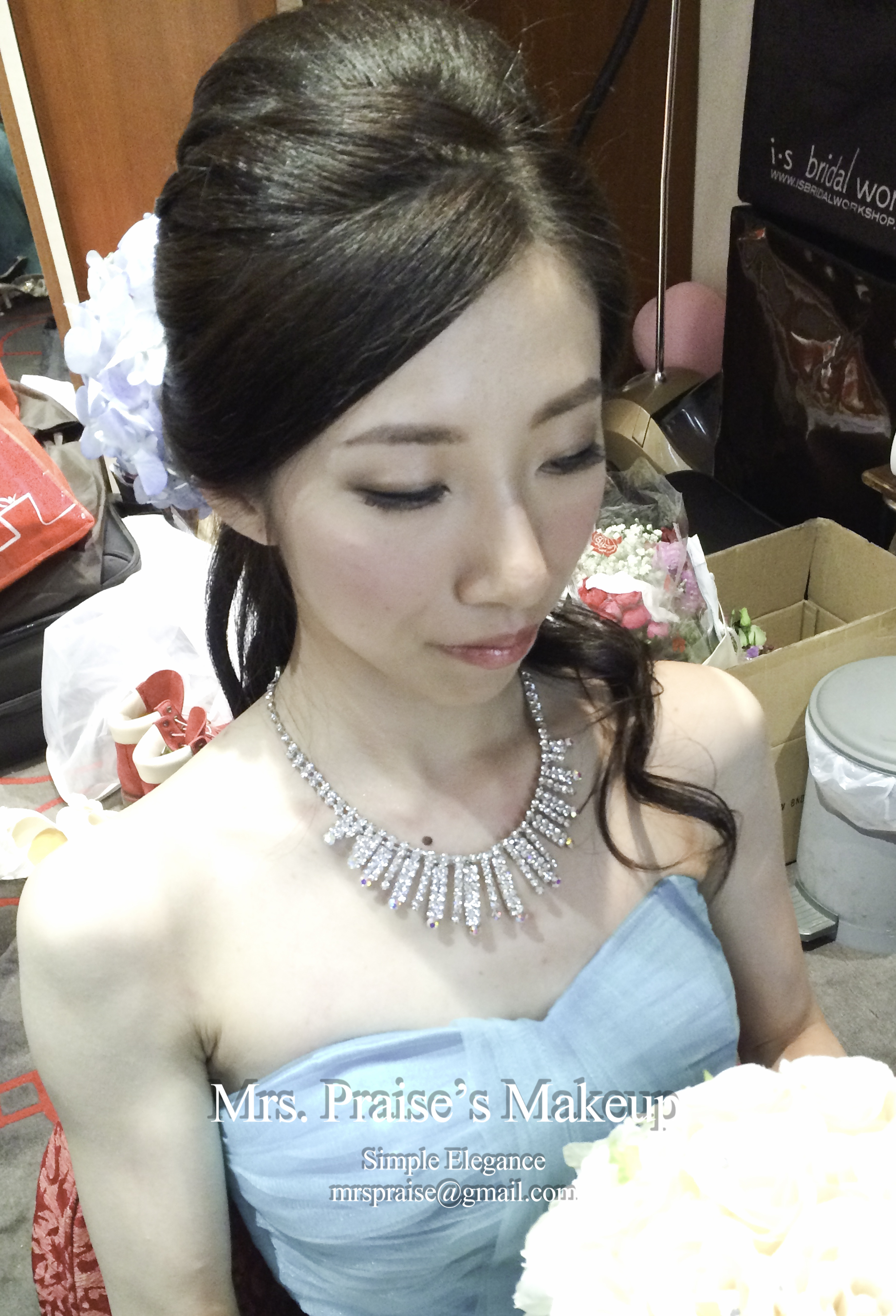 當天早上到達女家,Wylie告訴我她徹夜未眠,打點著婚禮的事情!那時我真的有點擔心,幸而我向來帶備不同性質的makeup product(所以化妝箱勁重!),立時派上用場,化妝後粉底貼面,充滿光澤感。Wylie說喜歡裙褂造型,問我是怎樣構想得出來的呢?怎樣知道會跟她合襯呢?唔。。。一方面是經驗累積,另一方面是化妝師必須要有的直覺吧!