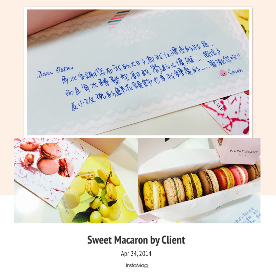 這天,新娘子Sarah找我退還髮飾時,送了我一盒Macaron連小字條,心裡剎是感動。新娘化妝工作完成了,關係似乎也漸告一段落了,但有些很窩心的客人如Sarah,卻是把你放在心上,還多次跟我說喜歡大日子的造型,令我備受鼓勵,無法不感動。別人看來,那不過是一盒小甜點,對我來說卻是意義重大。世界上沒有人有義務待你好,是嗎?謝謝Sarah,你的婚禮讓我十分難忘,感恩認識了你!:)