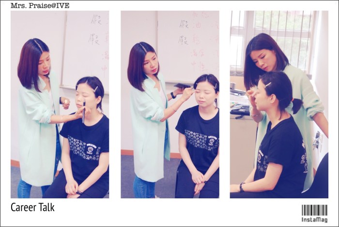 在講座裡,除了分享我入行的經過、原因和工作見聞等實際情況外,我一再鼓勵同學要增廣見聞,不要單單著眼現在修讀的科目而限制學習的機會,舉例說,我的不同背景容讓我與客人有不同層次的交流,別人也會因著你散發出的力量和氣質更為尊重你,甚至吸引人想跟你交朋友。我是貪心地希望他們除了記得實際資料外,還會對心路歷程更為深刻,畢竟他們會進入各行各業而不一定當上化妝師的。