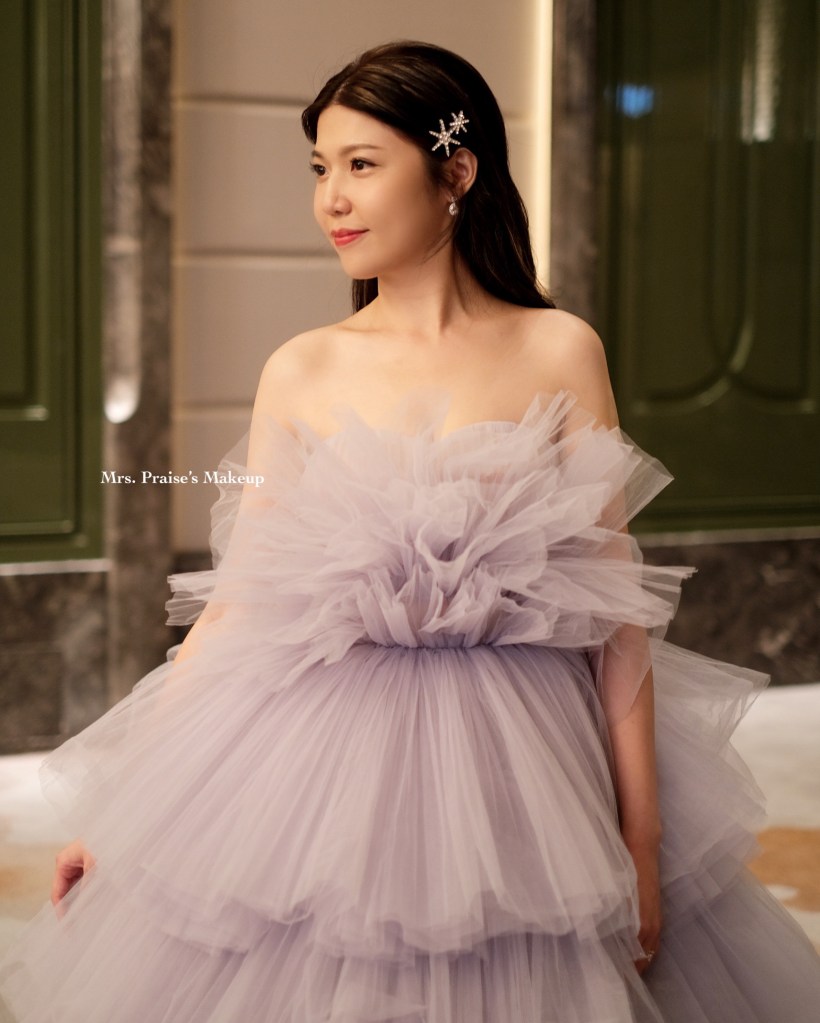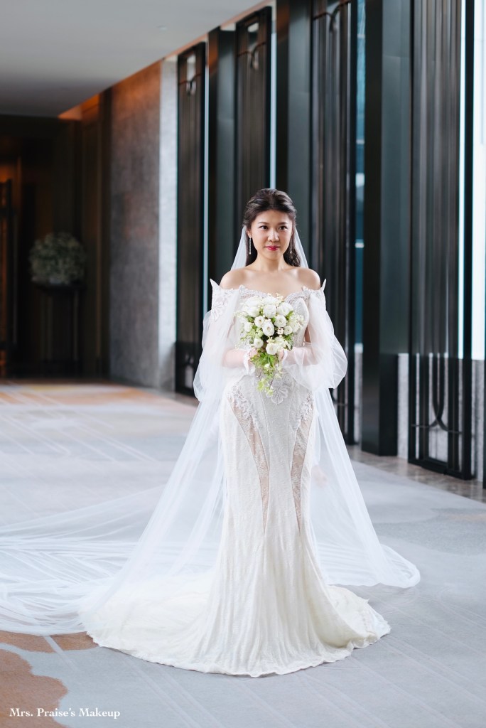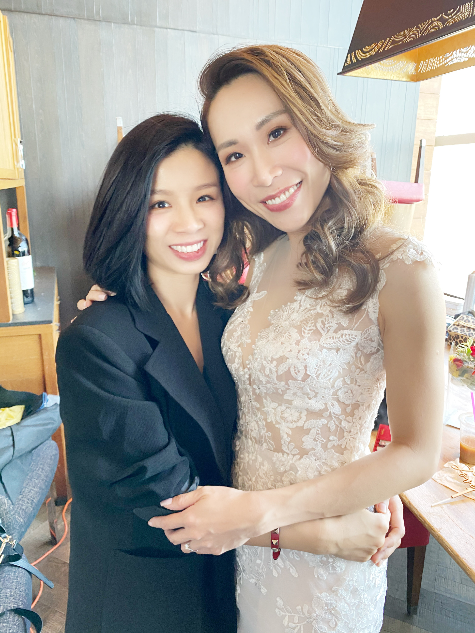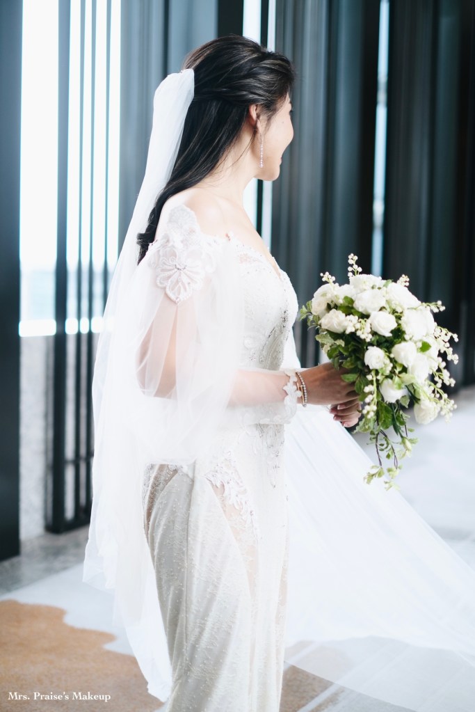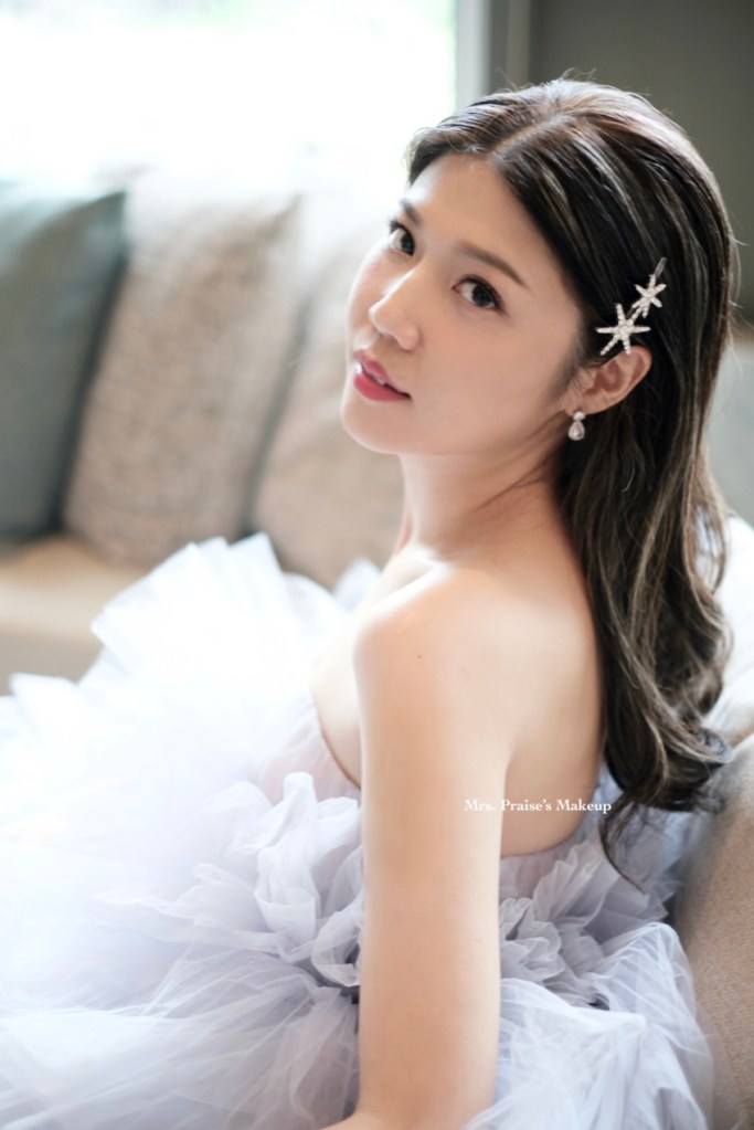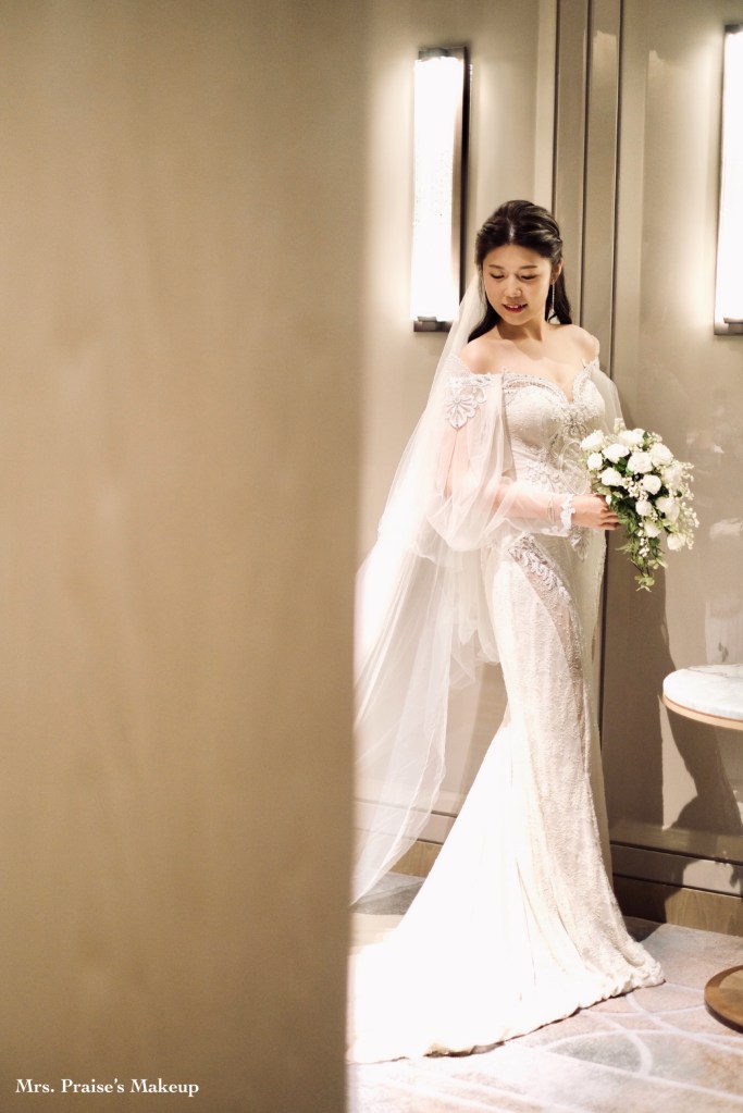 Evie很具氣質,加上纖瘦的身型,化妝和髮型真的不容有失,我要把漂亮的新娘化得更加漂亮,脱俗,讓人目不轉睛。Evie所到之處,賓客也大讚她很美,見到Evie笑得開心,我也很滿足。