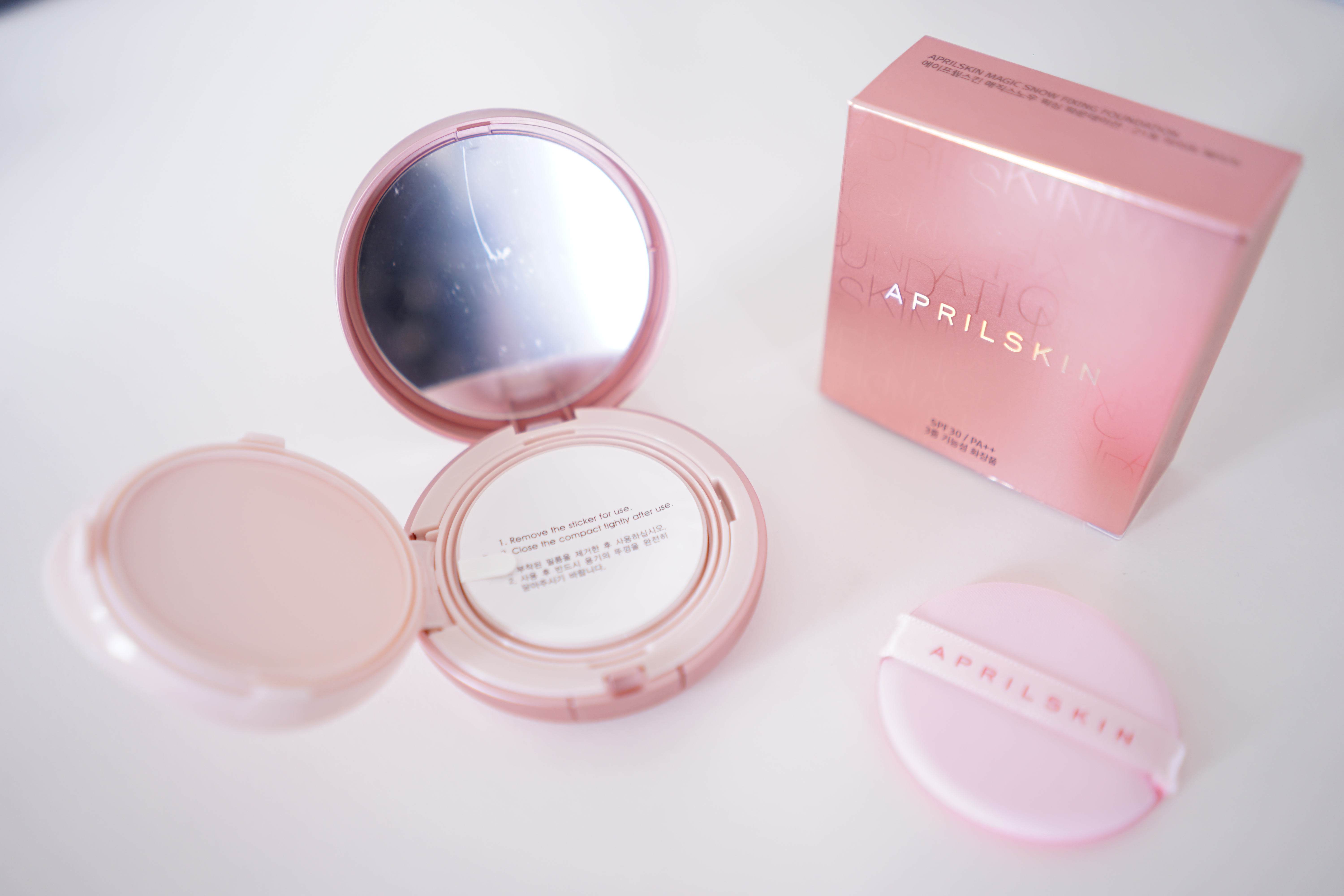盒子是玫瑰粉紅,很有少女味。內附一個粉卜,也是超級粉紅色的。論好握度和揭蓋開合的順暢度,個人覺得雪花秀勝一籌,AprilSkin很有玩具感,雪花秀比較貴氣和具質感(而且手握邊位較流暢)。