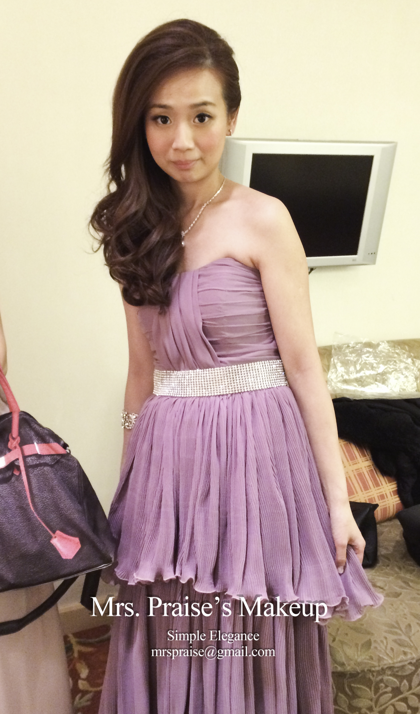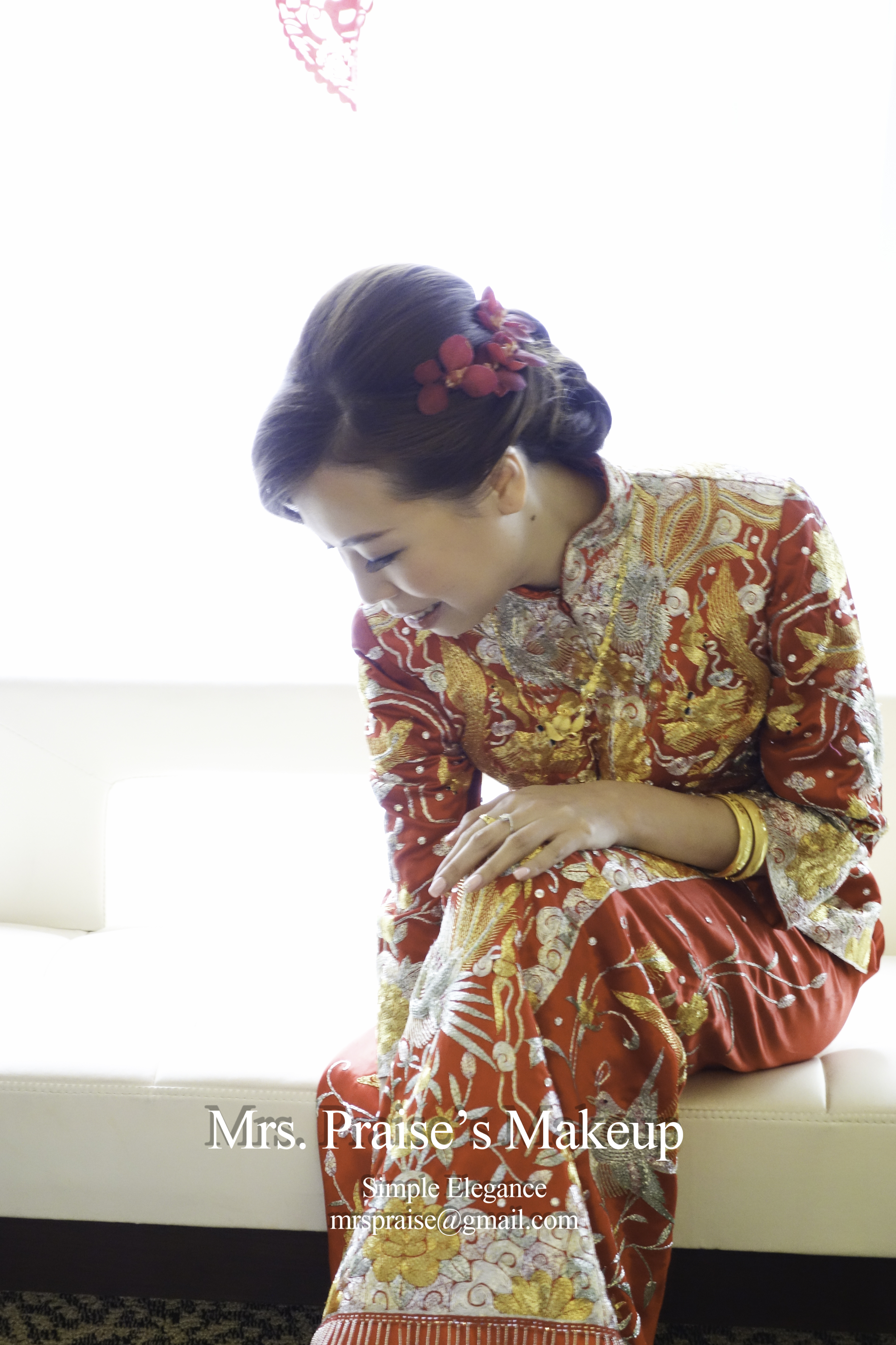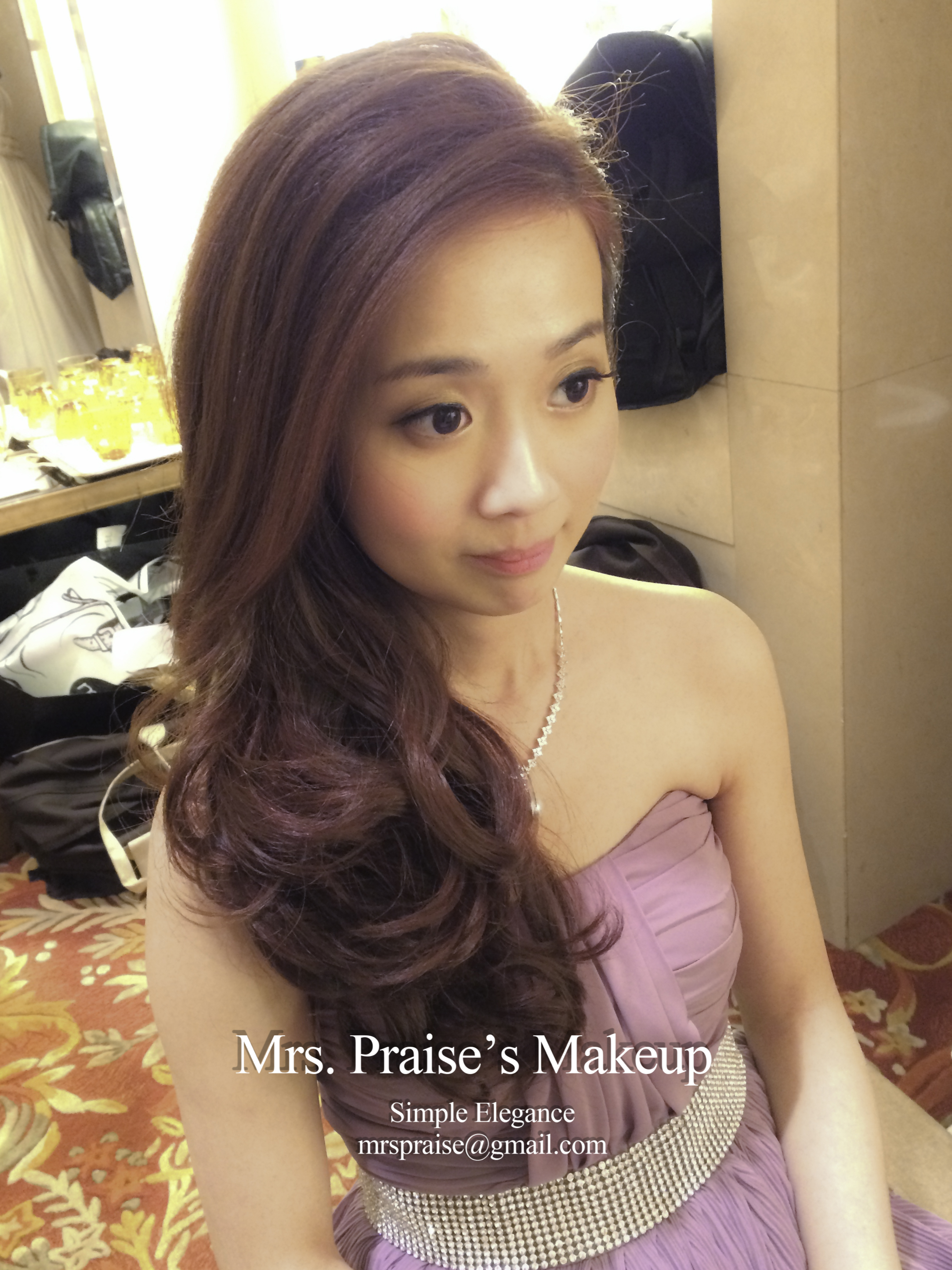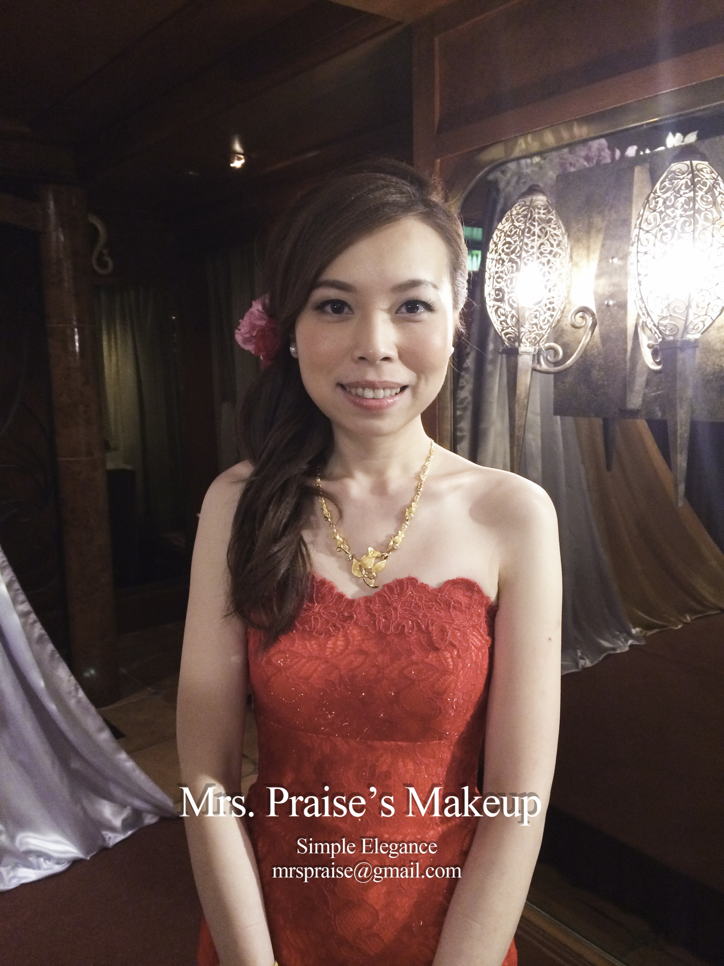 當天早上到達女家,Wylie告訴我她徹夜未眠,打點著婚禮的事情!那時我真的有點擔心,幸而我向來帶備不同性質的makeup product(所以化妝箱勁重!),立時派上用場,化妝後粉底貼面,充滿光澤感。Wylie說喜歡裙褂造型,問我是怎樣構想得出來的呢?怎樣知道會跟她合襯呢?唔。。。一方面是經驗累積,另一方面是化妝師必須要有的直覺吧!